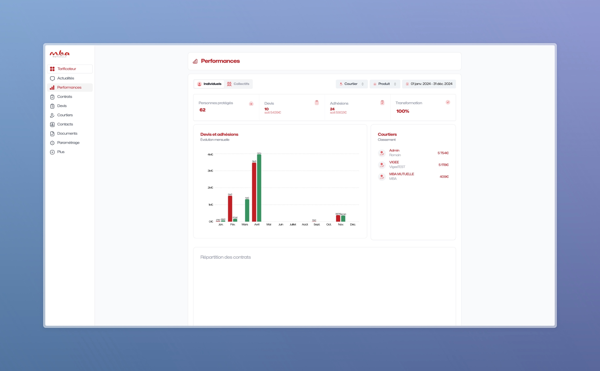L'application devait également permettre aux administrateurs Mba Mutuelle de gérer les clients, les offres de produits et de garanties, les devis et les contrats.